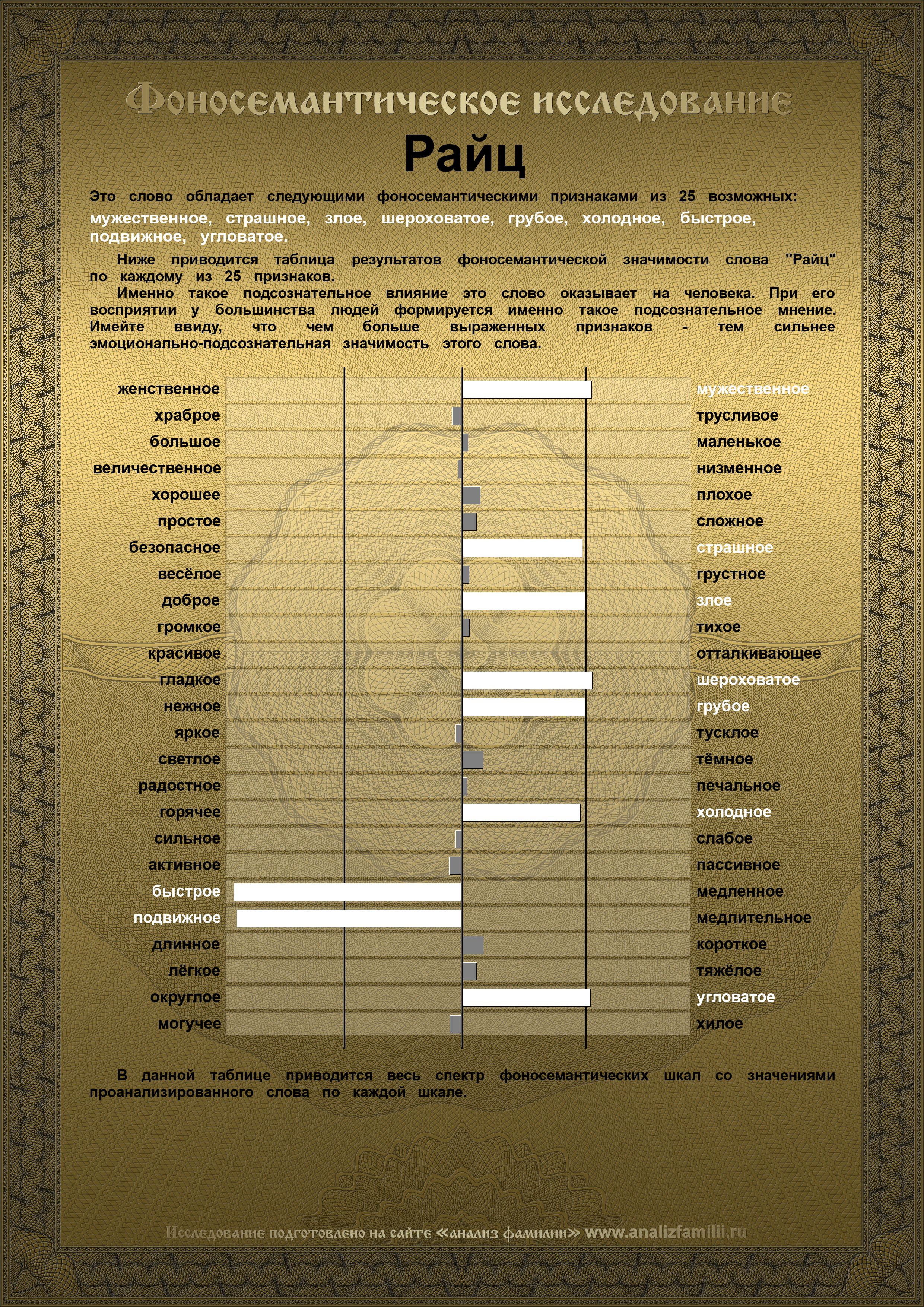 Фоносемантический анализ имени Райц выявил, что имя Райц имеет девять ярковыраженных фоносемантических признаков: мужественное, страшное, злое, шероховатое, грубое, холодное, быстрое, подвижное, угловатое |