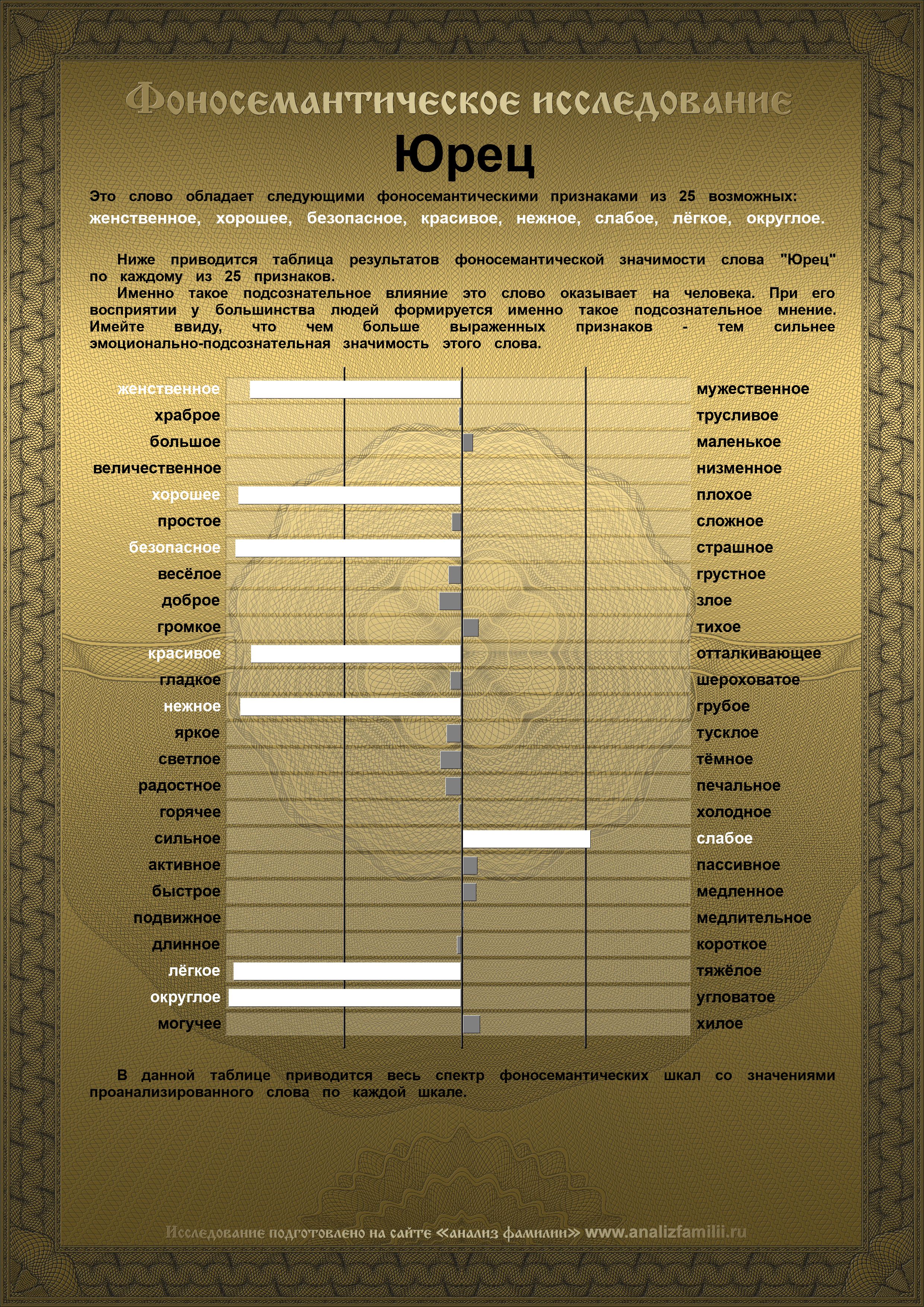 Фоносемантический анализ имени Юрец выявил, что имя Юрец имеет восемь ярковыраженных фоносемантических признаков: женственное, хорошее, безопасное, красивое, нежное, слабое, лёгкое, округлое |